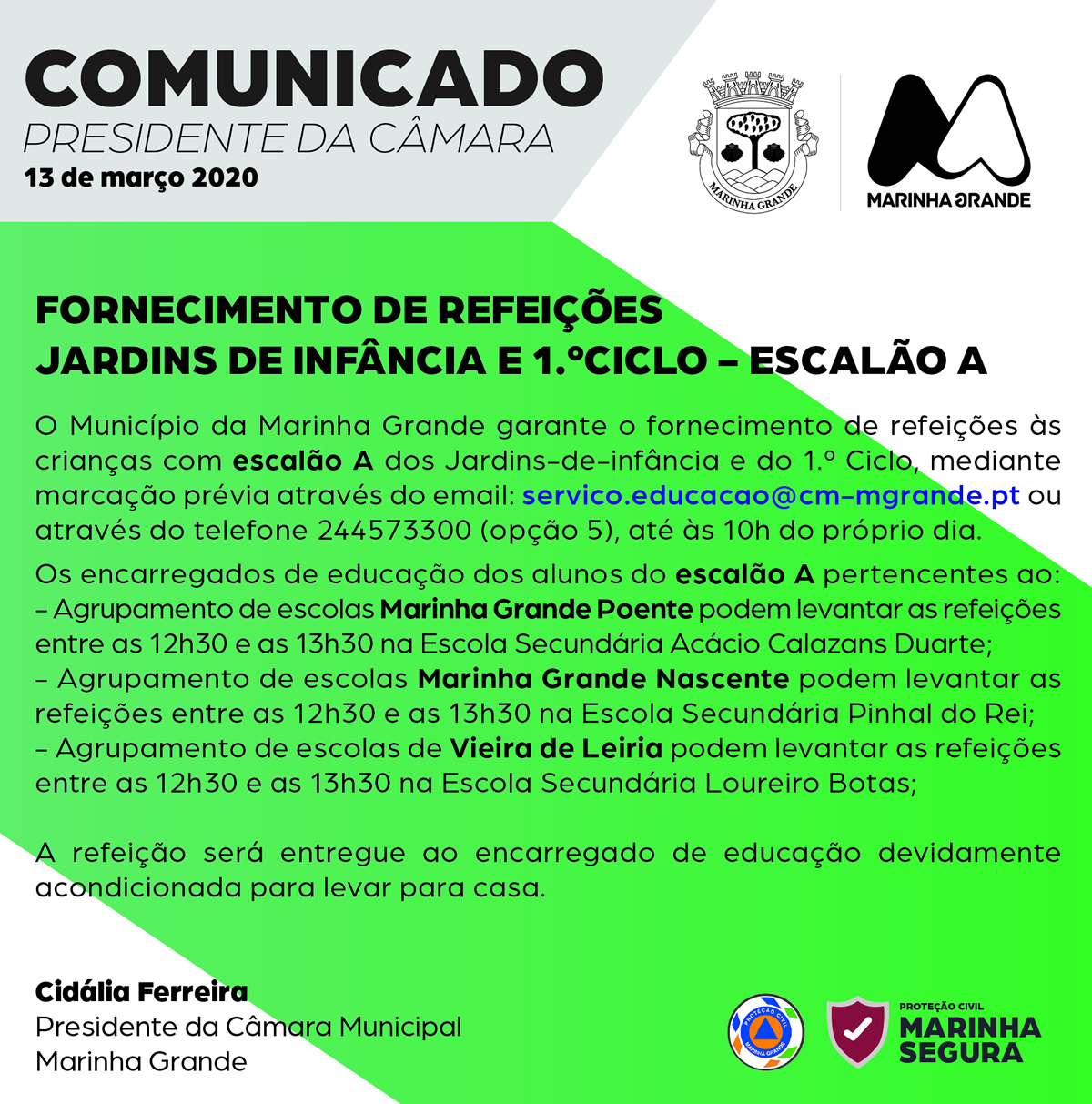 Os profissionais de saúde, das forças e serviços de segurança e de socorro que venham a ser mobilizados pela entidade empregadora ou pela autoridade pública para o serviço ou prontidão, impedindo que prestem a assistência aos seus educandos, podem solicitar o acolhimento dos seus educandos ao Agrupamento de Escolas Marinha Grande Nascente através do email Este endereço de email está protegido contra piratas. Necessita ativar o JavaScript para o visualizar..