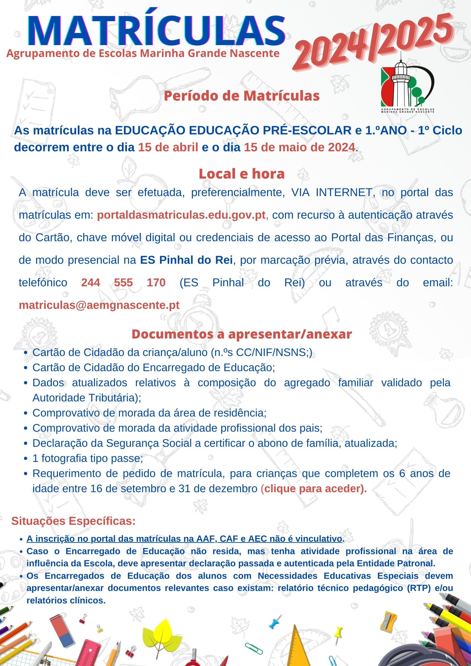 A inscrição/renovação da matrícula para o pré-escolar e 1.º ano do Ensino Básico arranca já segunda-feira, dia 15 de abril, e prolonga-se até 15 de maio.
