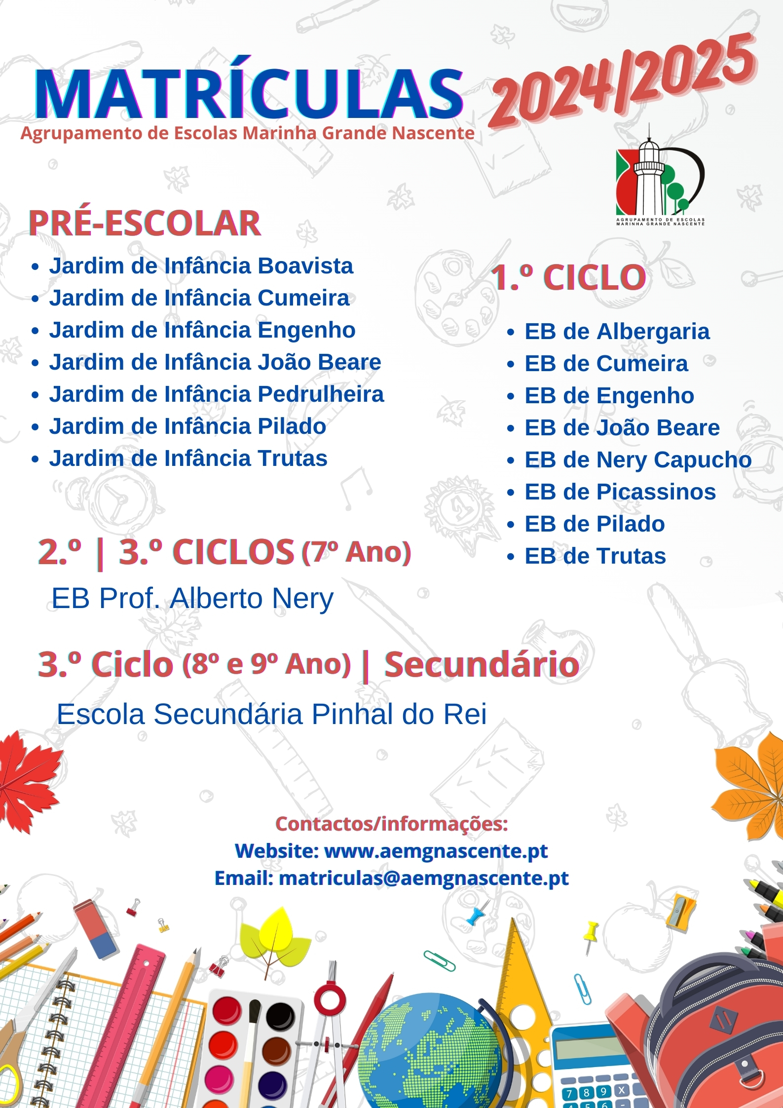 Na sequência da comemoração da Semana do Agrupamento Marinha Grande Nascente, irão decorrer, nas várias escolas, de 18 a 22 de março, diversas atividades dirigidas aos alunos dos vários ciclos, com o encerramento a ter lugar na Escola Secundária Pinhal do Rei, no dia 22 de março de 2024, conforme calendarização (ver calendário).Apelamos à participação/colaboração de toda a comunidade educativa.