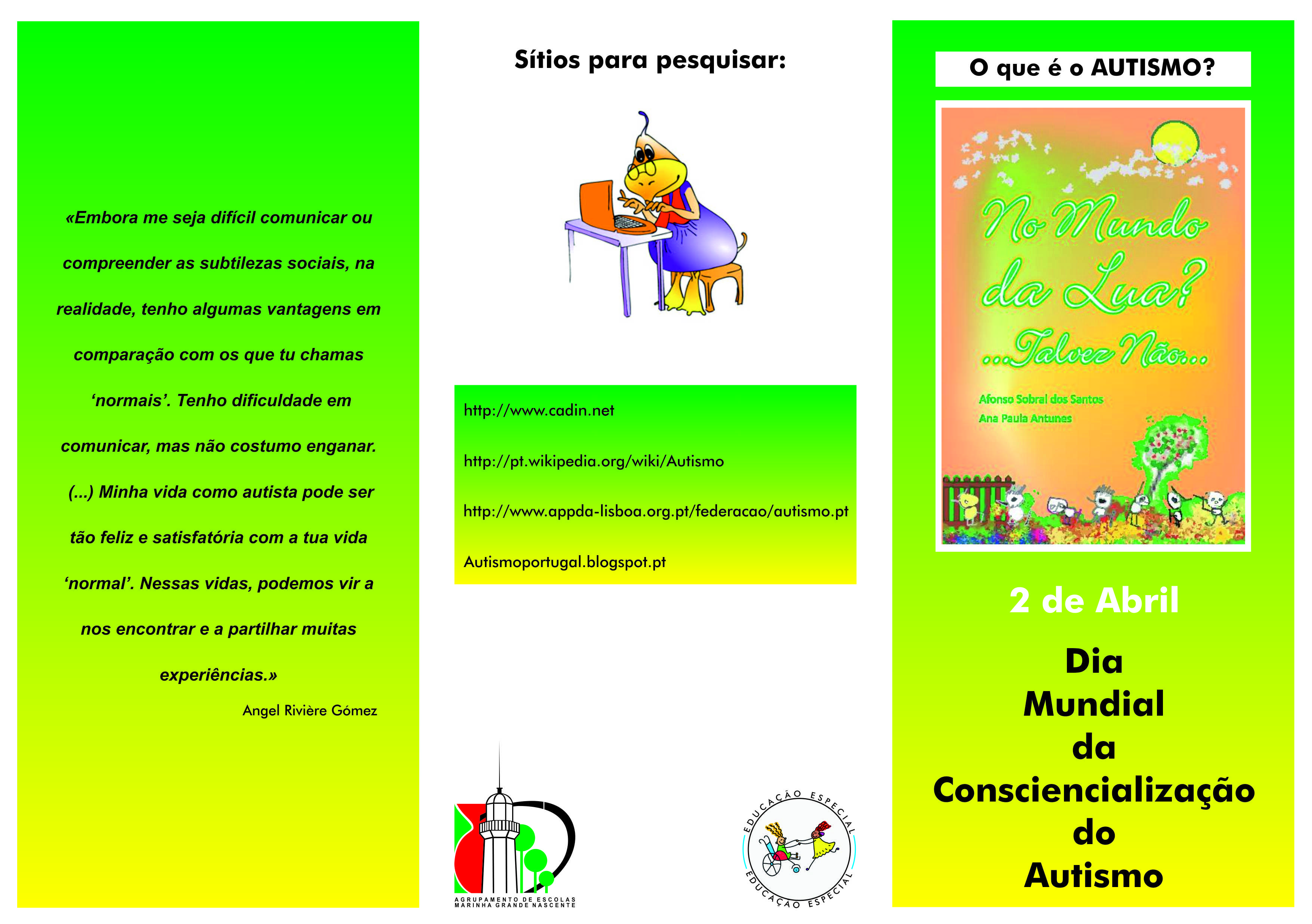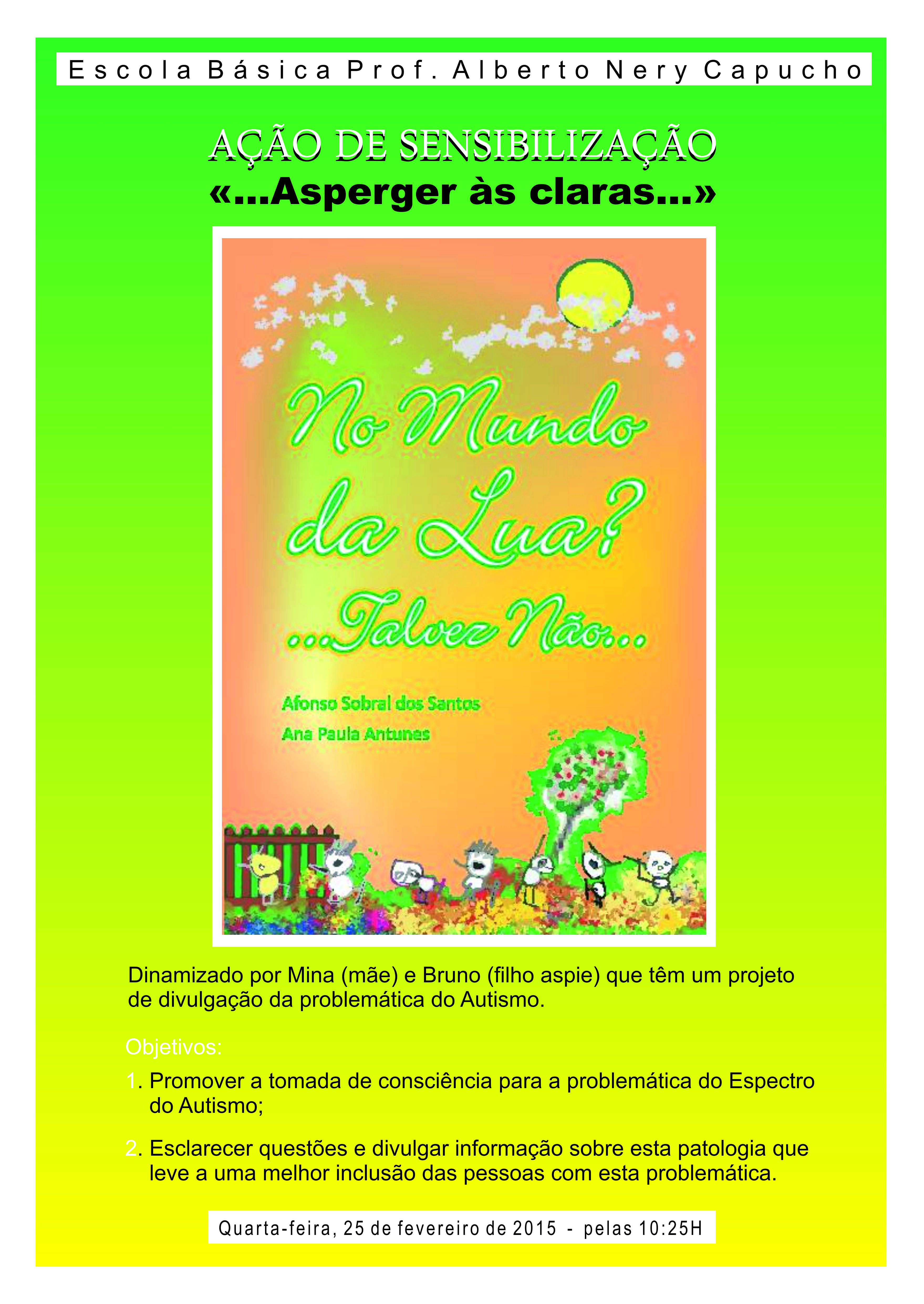 No âmbito do Dia Mundial da Consciencialização do Autismo, irá realizar-se uma Ação de Sensibilização subordinado ao tema " ...Asperger às claras...", no dia 25 de fevereiro, quarta-feira das 10h25 às 12h15m na Escola Básica Nery Capucho, organizada pelo Grupo de Educação Especial do Agrupamento.