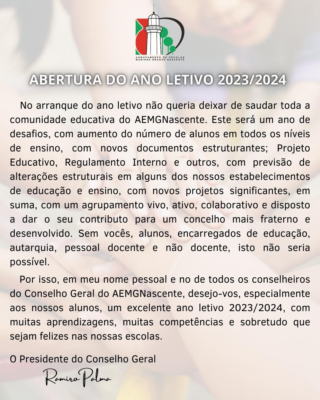 Estando convocada pela plataforma que integra nove estruturas sindicais do setor (ASPL, FENPROF, FNE, PRÓ-ORDEM, SEPLEU, SINAPE, SINDEP, SIPE e SPLIU), uma Greve Nacional de Professores e Educadores, para o dia 6/10/2023, informa-se a comunidade educativa que poderá não ser possível assegurar o normal funcionamento das atividades escolares em todos os estabelecimentos do Agrupamento.